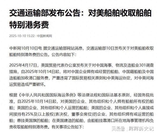 北京,2025年10月9日上午,商务部连续两则公告如雷。 61号文和62号文同时生效,全面强化稀土出口监管。华盛顿顿时爆发,特朗普总统愤怒地拍着白宫桌子:“也许我们应该停止购买中国产品!”然而仅仅24小时后,中国政府再次出击。交通运输部10日宣布,将对美国船舶征收“特殊港口费”,收费标准提高至每吨1000元。这是一次罕见的“双线反击”。从稀土到航运,从矿山到港口,中美贸易冲突进入新阶段。谁挡谁?谁被困在高墙内?悬念也从这一刻开始。稀土封锁:中国激活“国家王牌” 2025年10月9日上午,中国商务部正式宣布安2025年第61号和第62号公告进一步加强稀土相关物项出口管制。短短两份文件,瞬间震惊了世界高科技产业链。公告的核心内容是“稀土及相关技术出口,特别是境外军用关联交易实行许可证管理,原则上不予批准”。同时,法规范围首次扩大至“含有中国制造的稀土成分或采用中国制造的稀土技术的外国产品”。这意味着中国的出口监管已从“实物出口”扩大到“技术流动”和“产业扩张”。也就是说,即使未来外国企业在第三国使用中国稀土,也可能受到中国的管理制度的约束。外媒高呼这是一场“制度化的供应链革命”。为什么中国能做到这有信心吗?答案很简单。这是资源和技术的双头垄断。美国地质调查局的数据显示,2019年至2022年美国稀土进口量的72%来自中国。更重要的是,全球92%的精炼稀土产自中国。即使澳大利亚和美国重启稀土开采,也离不开中国的精炼、分离、磁体制造等核心技术。更有趣的是,美国对来自中国的稀有武器的担忧,已经写在防务报告中了。制造F-35战斗机大约需要0.4吨稀土。宙斯盾级驱逐舰需要2.4吨。弗吉尼亚级核潜艇需要多达4吨。美国内政部长布尔古姆在 10 月 10 日接受采访时承认:“中国目前控制着 20 种最重要的稀土矿物 85% 至 100% 的精炼能力。”这句“平息事态”听起来像是宣战,倒像是一种无奈的表白。毕竟美国还没有形成从矿山到磁体的完整稀土产业链,也还没有回归中国。中国的两次宣布不仅是资源战略,也表明中国不再只是世界工厂,更是供应链的守护者。 ——如果有人拿中国的资源作为筹码,中国有权收回这张牌。从那一刻起,贸易规则霸权悄然发生了变化。中方冷静、精准、合法地打响了反击的“第一枪”,而不是喊口号。特朗普总统的反应:“停止进口” 稀土出口限制的消息传到华盛顿后,特朗普总统勃然大怒。 2025年10月10日,他强硬表态,将考虑暂停大规模进口中国商品,并加征100%关税。这句话“加税100%”立即成为美国媒体的焦点。毕竟,征收100%的关税在经济上是差不多的。从数字上看,美国每年从中国进口的商品价值约为5600亿美元。如果特朗普总统计划将关税提高100%,仅额外关税的成本就将达到5600亿美元。此外,其中60%以上的商品是由美国公司在中国生产并再出口到美国。特朗普总统的目标是自己的供应链,而不是中国。同时,美国商务部的统计数据也更加真实。到2024年底,中国制造的产品仍占美国消费市场总量的28%。从电子元件到家居用品,短期内不可能建立替代供应链。更重要的是,特朗普总统似乎没有意识到,中国的反击不再是一次性的贸易回应,而是一场协调一致的贸易反击。反击。稀土出口监管的背景是制度的日益完善。港口税的准备工作已经在进行中。就在一天后,下午 3:00。 10月10日,中国交通运输部正式宣布:“根据国际海事规则和国际法基本原则,自10月14日起,对在美国注册的船舶以及美国公司拥有和运营的船舶征收‘特殊船舶入境费’。”此举也是对美国对中国船只指控的反击。演讲的内容可以说是适当对策的典范。 2025年10月14日起,价格为每净吨400元。 2026年4月起,涨至640元。 2027年开始涨至880元。 2028年开始,将达到1120元。每艘船每年最多开具五次发票。在多个端口的情况下在同一行程中,仅对第一个端口进行收费。这是有理有据的报复性反击。以马士基和地中海航运为例,由于美国资本在这两家公司持有大量股份,这意味着未来船舶进出中国港口的成本将大幅增加。该行业呈爆炸式增长,全球贸易观察家注意到了中国政府的精准和冷静。美股暴跌,2025年10月10日,美国华尔街重现“TACO交易”。在特朗普总统的关税威胁“成真”之前,资本市场就已经崩溃了。在总统宣布将对中国商品征收100%关税的数小时内,美国三大股指齐声下跌。道琼斯指数暴跌 878 点(1.9%)。标准普尔 500 指数下跌 2.71%。纳斯达克指数暴跌3.56%,创六个月来最大单日跌幅。一夜之间,七大科技公司市值那些公司(苹果、英伟达、亚马逊、谷歌、微软、特斯拉和 Meta)蒸发了约 7700 亿美元。资本市场不是情绪化的旁观者,而是最敏感的风险晴雨表。投资者很清楚,中国并不是一个容易受到威胁的目标。特别是稀土出口管制启动和口岸措施出台后,市场普遍预期美国供应链成本上升,中国反制力度进一步加大。加密货币市场也更直接地做出了相应的反应。随着美股暴跌,比特币和以太坊反而飙升,其中比特币上涨2%,以太坊上涨7%。投资者将与特朗普总统政策无关的资产定义为“安全资产”,并按照自己的意愿投票。金融分析师对这种情况很熟悉。 2018年以来,每当特朗普总统宣扬“对中国的威胁”时,股市都会暴跌。当他改变态度并说“谈判是可能的”时,股票市场凯特立刻康复了。于是,在