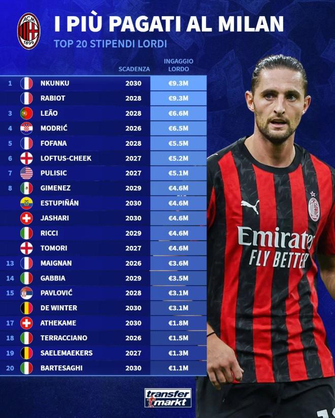 11月20日,德胡安列出了本赛季米兰球员的薪资分类。其中,两名法国球员恩昆库和拉比奥以930万欧元的年薪位居第一,而19岁的巴尔特萨吉则以110万欧元的年薪位居最后。 AC米兰年薪排名(欧元) 1. 恩昆库 930 万 1. 拉比奥 930 万 3. 莱奥 660 万 4. 莫德里奇 650 万 5. 福法纳 550 万 6. 洛夫图斯-奇克 520 万 7. 普利西奇 510 万 8. 希门尼斯 460 万 8. 埃斯图皮扬 460 万 8. 阿萨里460万 8. Rich 460万 8. Tomori 460万 13. Maninan 360万 14. Gabbia 350万 15. Pavlovic 310万 15. Derwent 310万 17. Arte Came 180万 18. Terraciano 150万 19. Sale Marker 130万 20.巴尔特萨吉 110 万