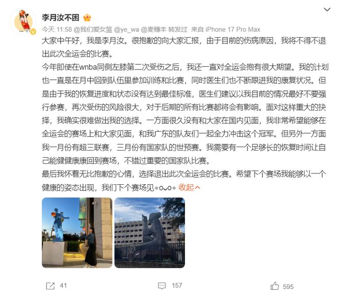 北京时间10月20日中午,WNBA球员李玉儿在自己的SNS上宣布,她将退出11月9日举行的大湾区全国赛。 李玉儿:对不起,因为受伤,我不得不退出这次全国赛。这是她今年在WNBA中第二次左膝受伤。不过,我一直对参加全国比赛抱有很大的希望。我的计划是在这个月中旬回到球队并参加训练和比赛,但我的恢复情况并没有达到预期。医生建议我不要太勉强自己,否则我再次受伤的风险会很高,这会影响以后的所有比赛。李还透露,一月份将有超三联赛(由WNBA球员组成的新联赛),三月份将有国家队世界杯预选赛。需要足够的恢复时间才能完全康复并再次参加比赛,不错过任何重要的国家队比赛。事实上,李Y10月16日,乌尔回国并出席艺术展开幕式。那一刻,我左膝上的铠甲终于脱落了。李月儿自10月5日起首次公开露面。10月5日,李月儿的左膝上还穿着防护服。从8月16日到10月16日,正好是8周时间,这与医学专家对李跃左膝扭伤的判断是一致的。不过,这只是膝伤的恢复计划,并不意味着他就能上场比赛。随着李玉儿的离去,广东国赛女篮从七大联盟变成了杨利伟、黄诗锦、杨淑玉、德拉纳、吴桐桐和陈明琳的六大联盟。这五人都是中国女篮现役队员或曾参加过比赛的队员。郑薇是这支广东省冠军女篮的主教练。李鱼儿可能是唯一能与国家队抗衡的国家官员四川女篮中锋韩旭。如果李月儿停止比赛,广东女篮挑战全国冠军的脚步肯定会黯然失色。四川女篮还拥有多名国手,包括李梦、王思雨、田媛媛、韩旭、高颂、贾赛奇等。