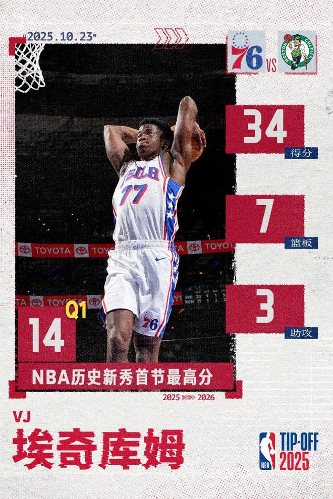 北京时间10月25日,NBA新赛季前四天的比赛结束,2025届新秀班的表现备受关注。 76人队的状元埃奇科姆仅用一场比赛就得到了34分,暂时领跑新秀得分榜。 4名球员场均得分超过15分,10名球员场均得分上双。当然,最让中国球迷担心的杨汉森,出场时间有限,距离场均两分还有很长的路要走。 NBA新赛季新秀得分榜:1.第3顺位埃奇库姆34分(76人)2.第6顺位特雷·约翰逊16.5分(奇才)3.第7顺位菲尔斯15分(鹈鹕)4.第11顺位科怀·德文15分(灰熊)5.第2顺位哈珀14分(马刺)6.第1选秀弗拉格 14 分 (小牛队) 7, 第八顺位 贾明 11.5 分 (篮网) 8, 第 4 顺位 快船 11 分 (黄蜂) 9, 3 第 4 顺位 卡尔克布伦纳 10 分 (黄蜂) 10, 18 顺位 克莱顿 10 分 (爵士) 16 顺位 Jan H安森2分(开拓者队)3号秀埃奇库姆首秀打出34+7的战绩,被评为最有价值球员。最后的选秀新秀埃奇科姆(Edgecomb)是 1976 年年度最佳新秀的热门人选,在新秀得分排行榜上名列前茅。到目前为止,他只打了一场比赛。揭幕战以一分险胜凯尔特人,恩比德9投1中梦游,但埃奇科姆挺身而出,与马克西组成双向利器,光芒四射。除了马克西拿下40分之外,埃奇库姆也贡献了亮眼的表现,投进5个三分球,得到34分7篮板3助攻1抢断。埃奇库姆首节14分超越詹姆斯的12分,刷新了NBA首节球员得分纪录,而他的34分则创下了21世纪新秀首节得分纪录。 21世纪还没有其他新秀在首秀中得到30分。 2002年,吉利切克以2分位居21世纪新秀得分榜第二位。9分。 Edgecombe能否在下一场比赛中继续他的首秀还有待观察。但到了夏天,从联赛表现到季前赛和开幕日,20岁的埃奇库姆展现出了他年轻的品质,成为了年度最佳新秀的热门候选人。 4名新秀场均得分至少15分,10名新秀场均得分上双。此外,目前有四名新秀场均得分至少达到 15 分。 19岁的特雷·约翰逊是奇才队的第六顺位新秀,场均得到16.5分。他在前两场比赛中分别得到16分和17分。重建团队有望取得重大进展。选择鹈鹕队的7号新秀、19岁的他在两场比赛中场均得到15分,而灰熊队的11号新秀、22岁的考沃德在两场比赛中场均得到15分。尽管灰熊队前场伤病较多,但考沃德还是抓住了机会,表现出色。目前新秀得分榜上,共有10名球员场均得分达到两位数。其中,19岁的马刺队二号秀哈珀和18岁的小牛队状元弗拉格在两场比赛中场均得到14分。哈珀表现高效,场均24分钟得到14分4.5篮板2.5助攻。他和文山有望成为马刺队未来的伟大二人组。弗拉格被安排在弱控卫位置上,因此他场均33分钟内得到14分、7.5个篮板、3次助攻和1次抢断,表现不太理想。最终,他场均出现四次失误,投篮命中率仅为37%,三分命中率为33.3%。黄蜂队两名新秀场均得分上双,其中四轮新秀快船拿下11分,二轮新秀卡尔克布伦纳拿下10分。后者是目前唯一场均得分达到两位数的二轮秀。杨汉森场均仅得2分,而且这位中国球星还没有进入常规轮换阵容。当然,中国足协ns更关心的是20岁的中国新星杨汉森,他目前场均出场时间只有6.5分钟,得到2分1篮板1盖帽。扬·汉森尚未进入开拓者队的常规轮换阵容。前两场比赛上半场时间有限。中间我基本碰不到球,只能在垃圾时间来回拿东西。扬·汉森的投篮命中率并不理想,两场比赛4投1中,连外线三分球都投不中。开拓者队以控球后卫和前锋为主,新秀扬·汉森在短时间内想要增加上场时间将会非常困难。要想真正立足,还有很长的路要走。 (醉沃浮申撰)