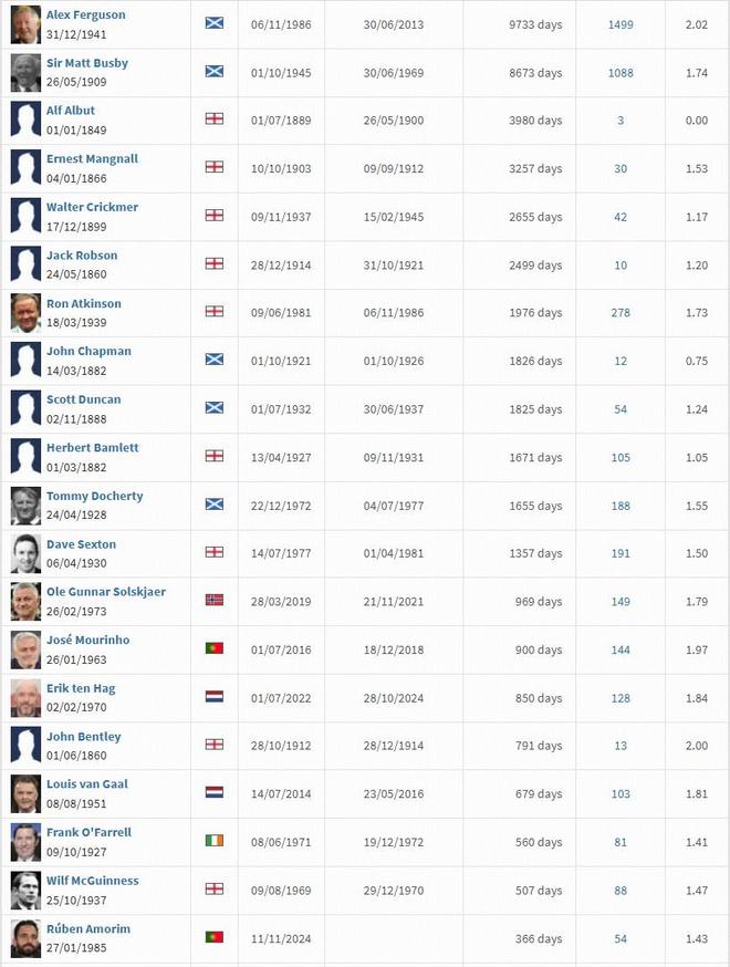 北京时间11月12日,阿莫里姆成为第20位在曼联任职超过一周年的主帅,此前他执教曼联已经一年多了。在曼联历史上,在执教超过一年的主教练中,弗格森以9733天的执教天数排名第一,巴斯比紧随其后,位居第二。单届执教曼联一年的教练排名: 1.弗格森,执教9,733天(时期:1986-2013) 2.巴斯比,执教8,673天(时期:1945-1969) 3.阿尔巴特,执教3,980天(时期:1889-1900) 4.曼格纳尔, 3257 1903-1912 5. Creamer 2655 天 1937-1945 6. Jack Robson 2499 天 1914-1921 7. Ron Atkinson 1976 天 1981-1986 8. John Chapman 任教 1826 天 (1921-1926) 9. Scott Duncan 任教1825 天(1932-1937) 10. 邦姆莱特执教 1671 天(1927-1931) 11. 汤米·多切蒂(Tommy Docherty)执教 1655 天 12. 塞克斯顿,担任教练 1,357 天(1977-1981) 13. 索尔斯克亚,担任教练 969 天(2019-2021) 14。穆里尼奥,担任教练 900 天(2016-2018) 15. 海格十队,担任教练 850 天(2022-2024) 16. 本特利执教 791 天(1912-1914) 17. 范加尔执教 679 天(2014-2016) 18. 奥法雷尔执教 560 天(1971-1972) 19. 麦吉尼斯任教 507 天(任期:1969-1970) 20. 阿莫林任教 366 天(任期:2024 年至今)(注:任期长度不包括主教练的其他短期任期。(仅算作从任命到任期结束的一个完整任期)[仅在 MIG 上查看英超联赛]
