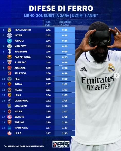 当地时间11月14日,德国转会市场在社交媒体上公布了近五年来联赛场均失球数排名前五的俱乐部名单,以及场均失球数最少的球队名单(联赛出场数超过100场的球队)。近五年五大联赛场均失球最低名单: 1、皇马:总计失球141个,场均失球0.862个;国际米兰:总计失球143个,场均失球0.883个;那不勒斯:总失球144个,场均失球0.884个;曼城:总失球145个,场均失球0.895个;尤文图斯:6球失14球,场均失0.906个;巴塞罗那:失球156个,场均失球0.957个;毕尔巴鄂竞技队:丢球158个;平均每场0.968;阿森纳:159个失球;平均每场0.989;马德里竞技队:失球160个;影音每场比赛平均分 0.9810;巴黎圣日耳曼:失球155个,场均失球0.9911,罗马:失球167个,场均失球1.0212,尼斯:失球161个,场均失球1.0313,朗斯:失球164个,场均失球1.0514,利物浦:失球172个,场均失球1.0514。场均1.0615、皇家社会:总失球172、场均失球1.0616、AC米兰:总失球175、场均失球1.0717、拜仁慕尼黑:总失球158、场均失球1.0818、都灵:总失球179、场均失球1.1019、马赛:177进球数 总失球数,场均 1.1320 里尔:总失球数 177,场均 1.13 【仅在咪咕上查看英超联赛】